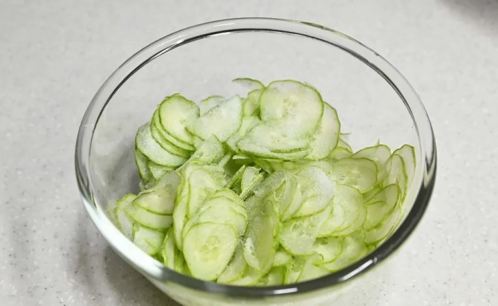 오이는 슬라이스로 썰어주고 소금 약간을 더해 절여주세요.