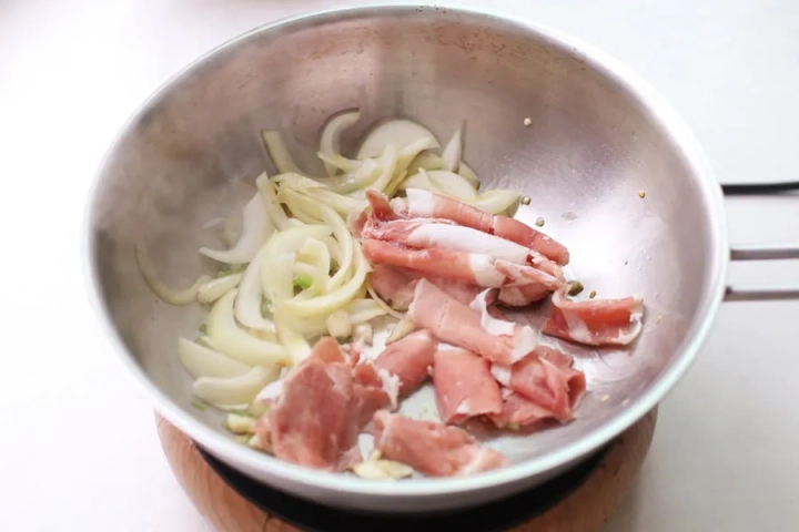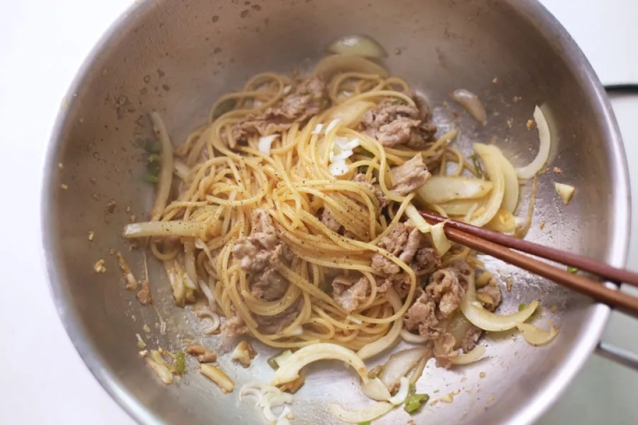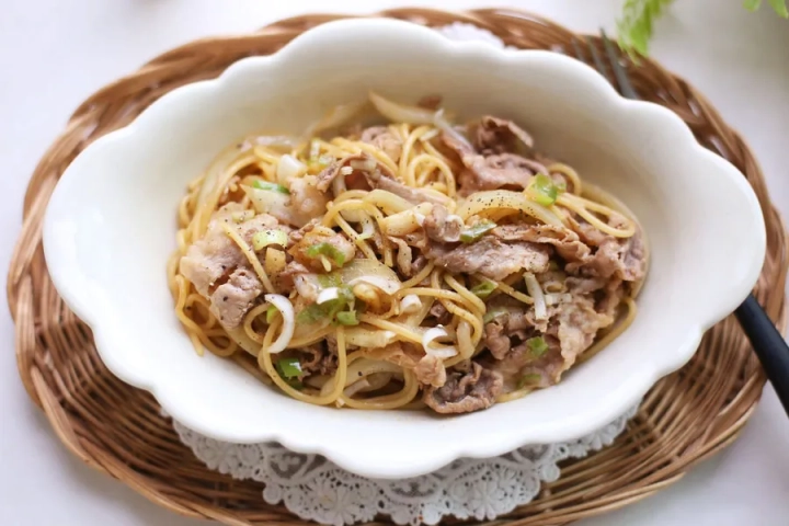 [재료]: 차돌박이 100g, 스파게티면 100g, 양파 1/2개,