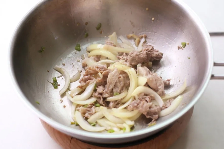 채썬 양파와 차돌박이를 넣고 가볍게 볶아주세요.