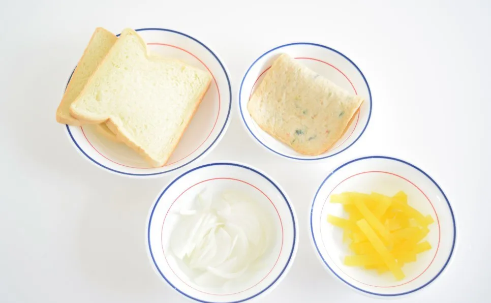 [재료]: 식빵 2장, 사각어묵 1장, 양파 1/4개,