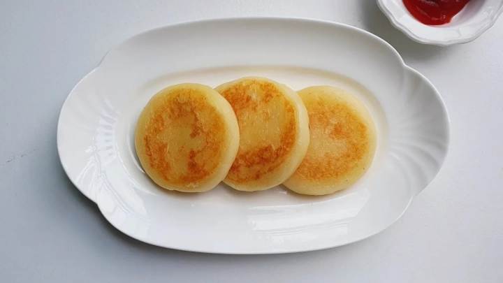 감자반죽을 크게 떠서 납작하게 만들어주고