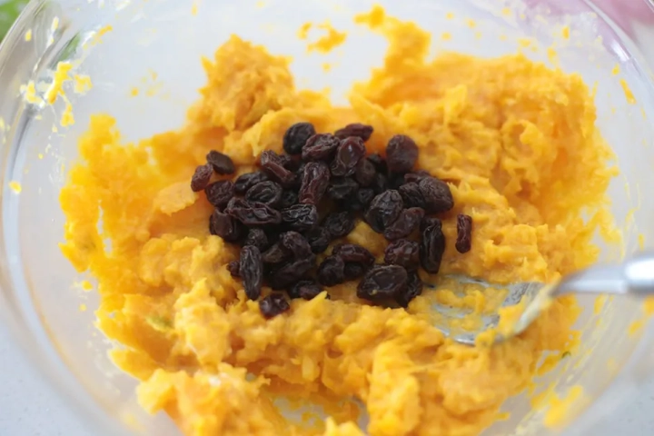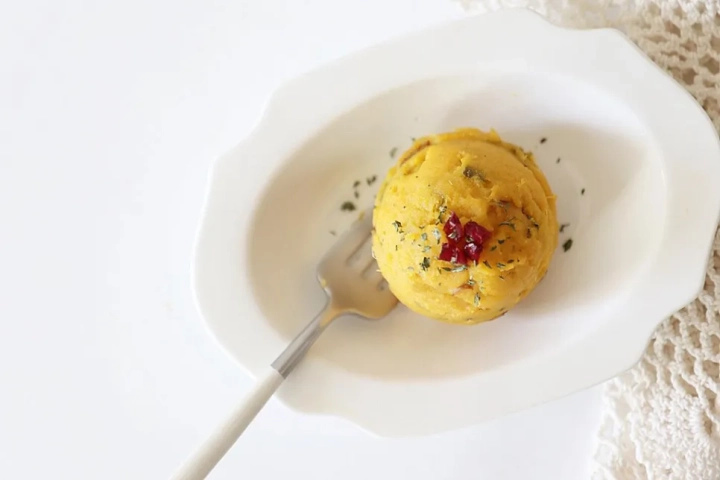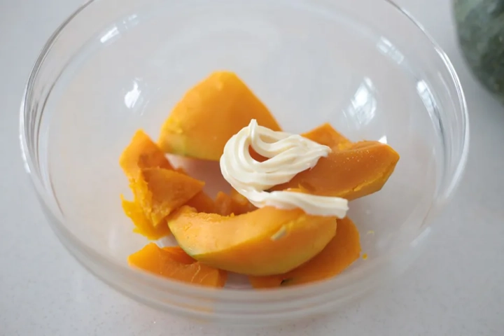 쪄낸 단호박에 마요네즈를 더해 으깨주세요.