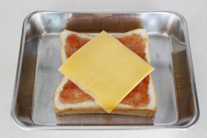 딸기잼 위에 치즈 1장을 올려주세요.