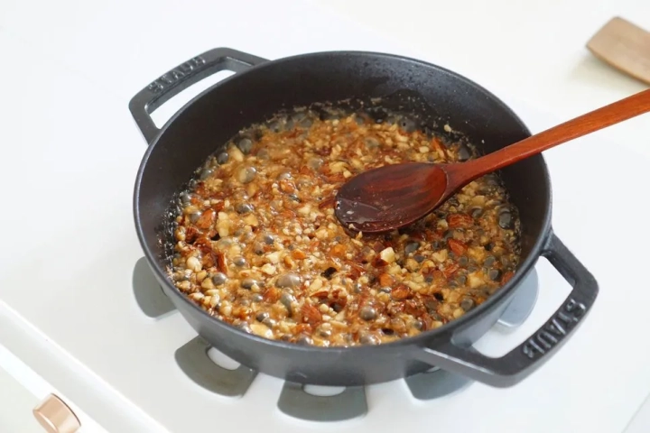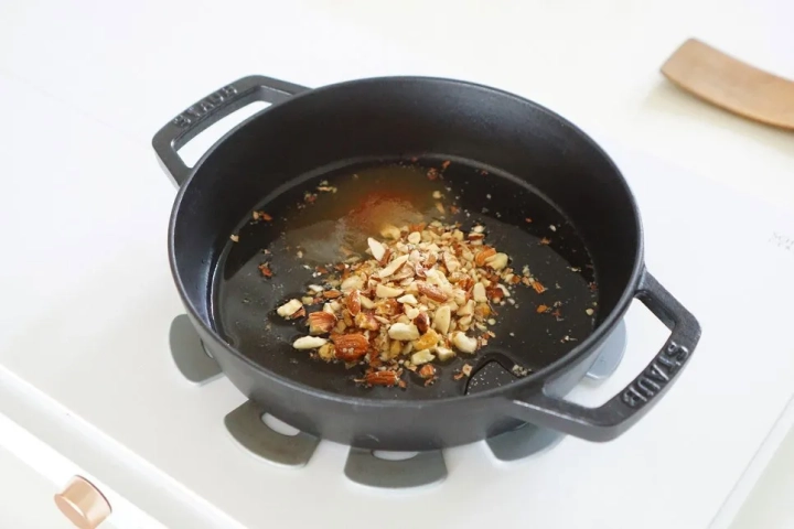 시럽이 끓어오르면 호두를 넣고 바짝 졸여주세요.