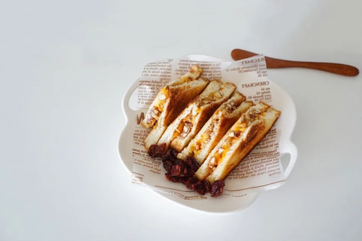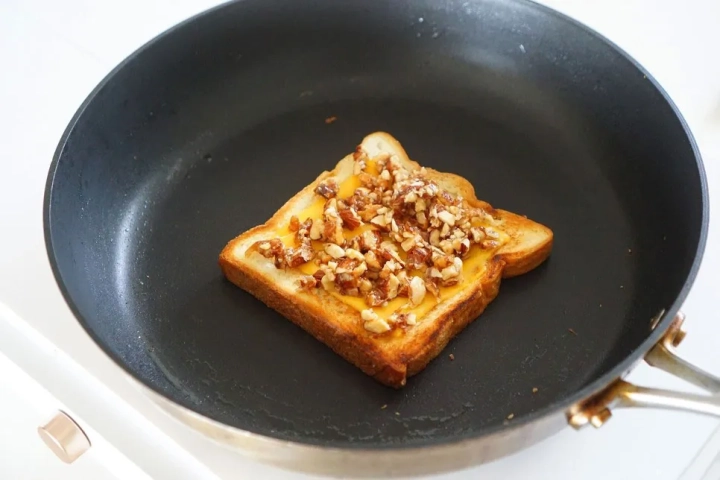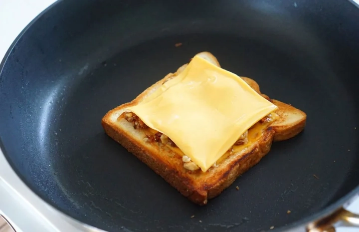 식빵 한쪽면에 슬라이스치즈 1장 올리고 위에 호두를 올려주세요.