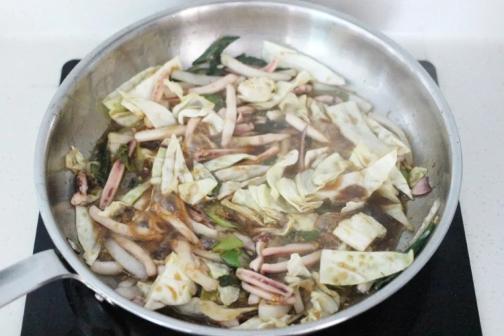 설탕이 골고루 잘 녹으면 양배추, 양파를 넣고