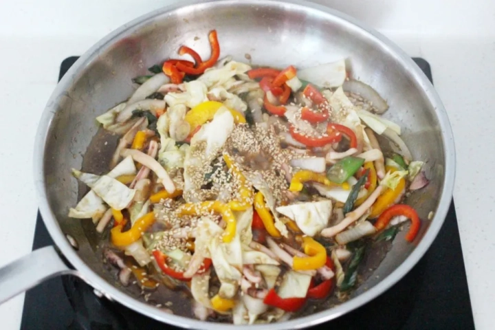 오징어를 넣고 설탕 1큰술을 더해 볶아주세요.