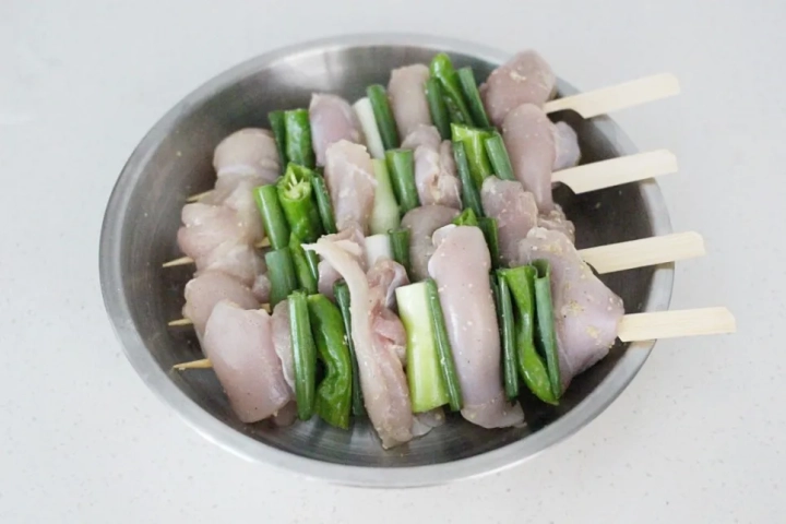 꼬치에 닭고기, 대파, 고추를 꽂아주세요.