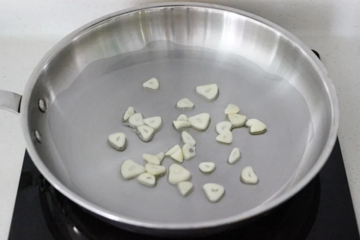 팬에 식용유를 두르고 마늘을 볶아주세요.