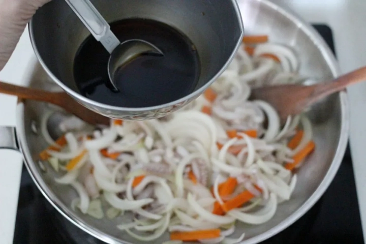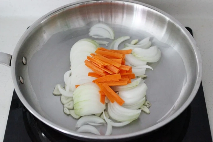 마늘 향이 올라오면 양파와 당근을 볶아주세요.