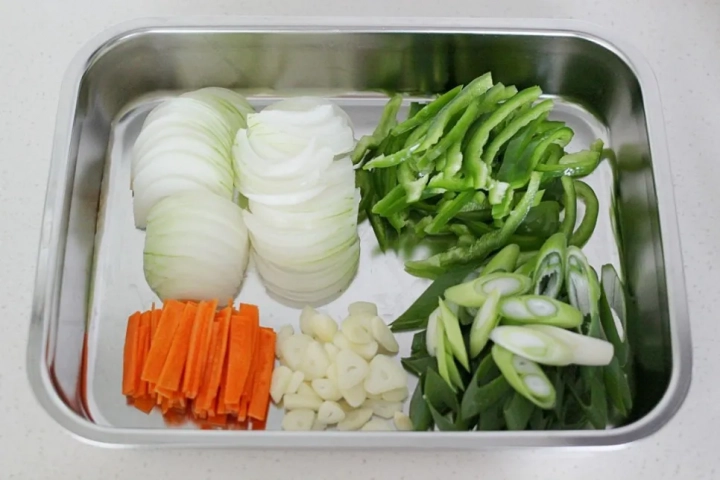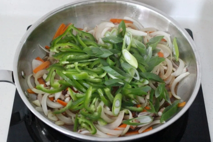 양파, 피망, 당근은 비슷한 길이로 채를 썰어주고