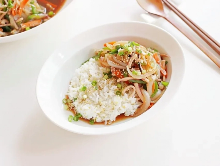 고슬고슬한 밥에 촉촉한 오징어볶음 얹어