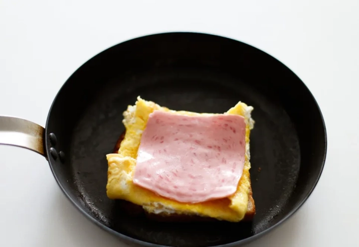 [재료]: 식빵 1장, 달걀 2개, 슬라이스치즈 1장, 슬라이스햄, 소금, 버터