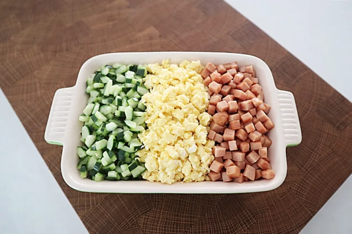 [재료]: 스팸 200g, 달걀 3개, 오이 1개, 양파 1개