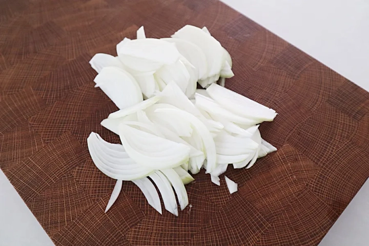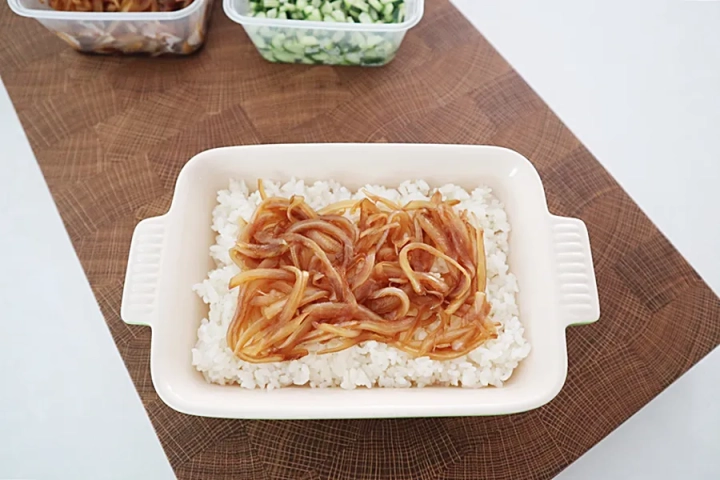 그릇에 밥을 담고 양파볶음을 취향껏 올려주세요.