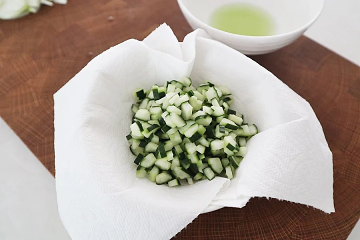 오이는 가운데 씨 부분을 제거하고 잘게 썰어