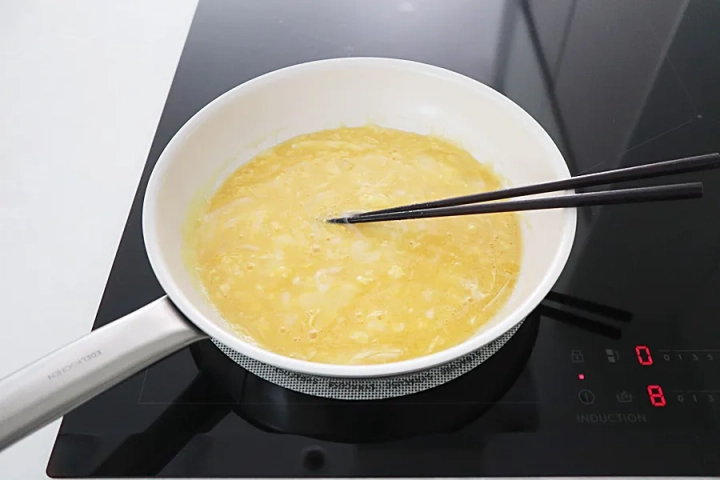 달군 팬에 달걀물을 부어 스크램블을 만들어주세요.