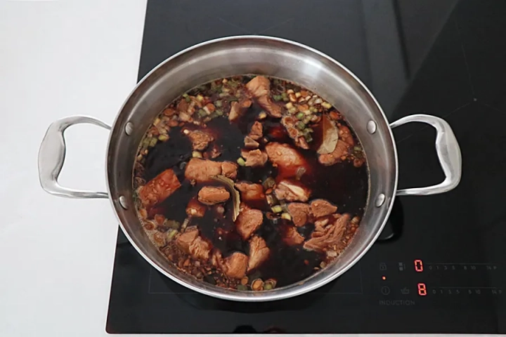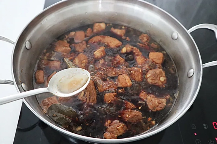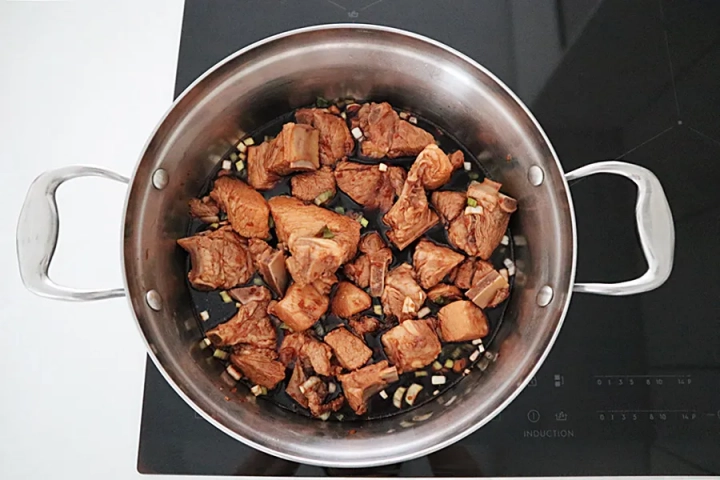 숙성시킨 갈비에 월계수잎과 물 800ml를 넣고