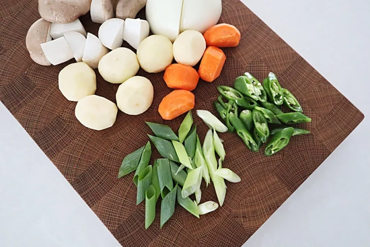 감자, 당근이 어느 정도 익으면 버섯과 양파를 넣고 끓여주세요.