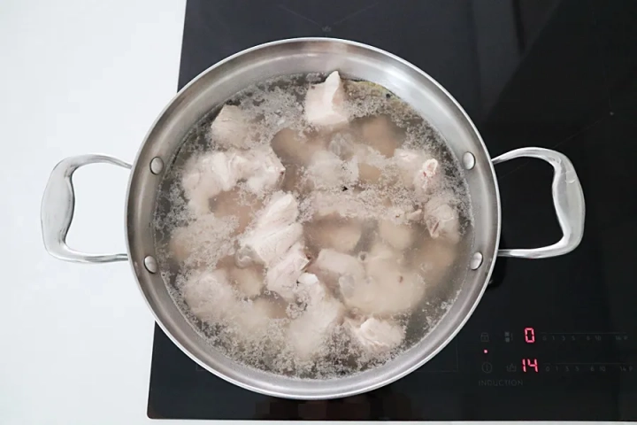 월계수잎과 통후추를 넣고 5분 정도 삶아주세요.