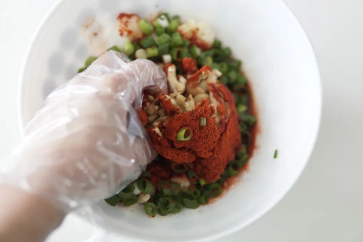 [양념재료]: 고춧가루 4큰술, 액젓 1큰술, 간장 2큰술,