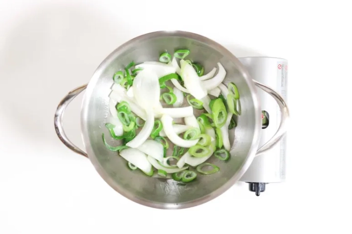 달군 팬에 기름을 둘러주고 대파와 양파를 볶아주세요.