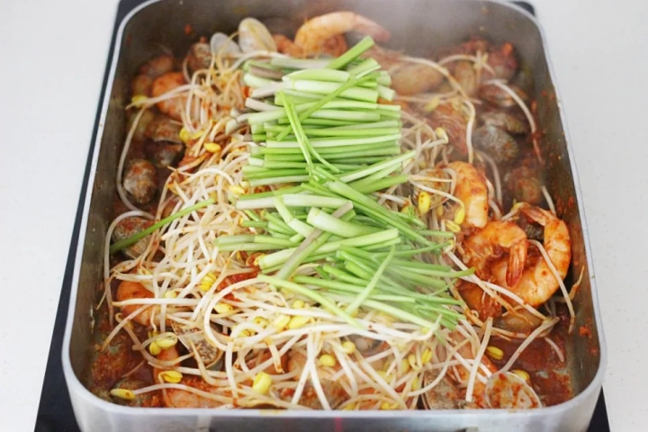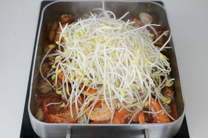 [재료]: 새우 500g, 바지락 200g, 콩나물, 미나리, 다진마늘 1.5큰술,