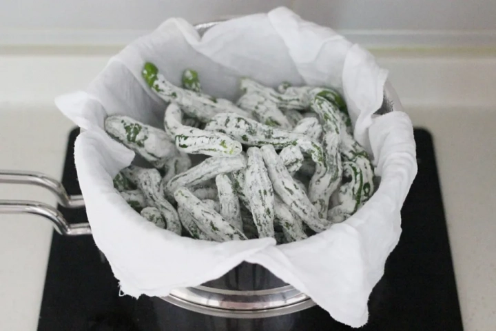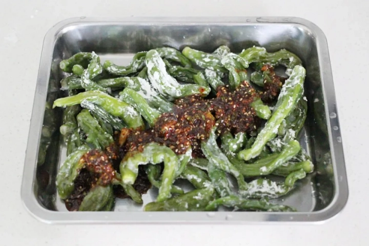 [재료]: 꽈리고추 200g, 소금 1작은술, 밀가루 3큰술