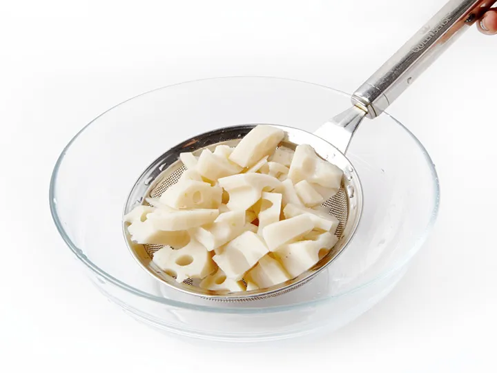 데친 연근은 찬물에 헹궈 식힌 뒤 체에 받쳐 물기를 제거해주세요.