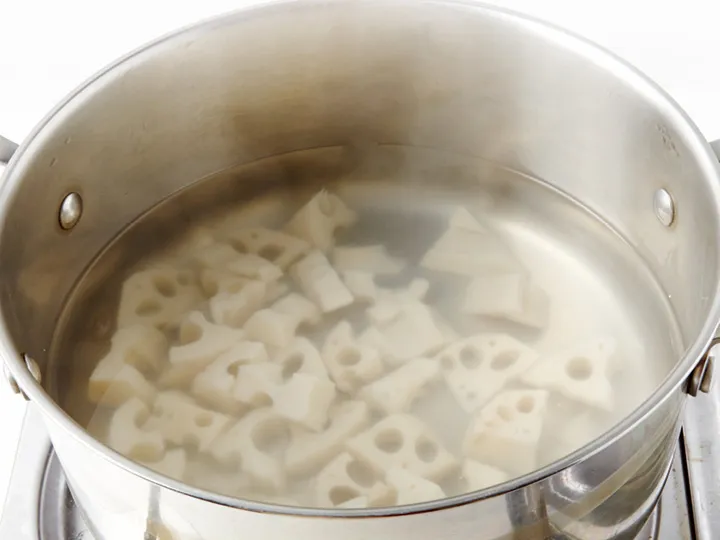 끓는 물에 식초 1큰술을 넣고 연근을 1분 정도 데쳐주세요.