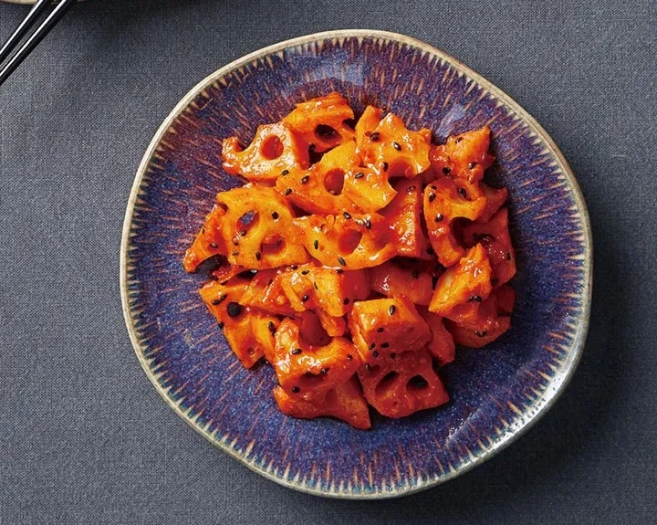 한김 식힌 연근을 양념장에 골고루 무쳐주고