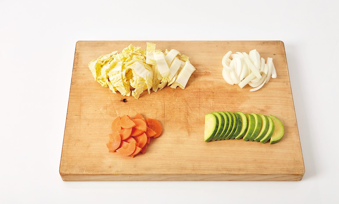 [재료]: 돼지고기 300g, 배추 4장, 양파 1/2개,