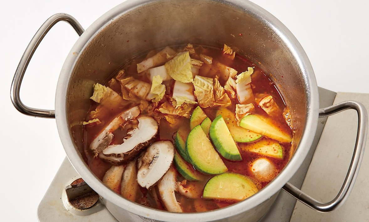 물 5컵을 넣어 끓어오르면 호박, 버섯, 배추를 더해