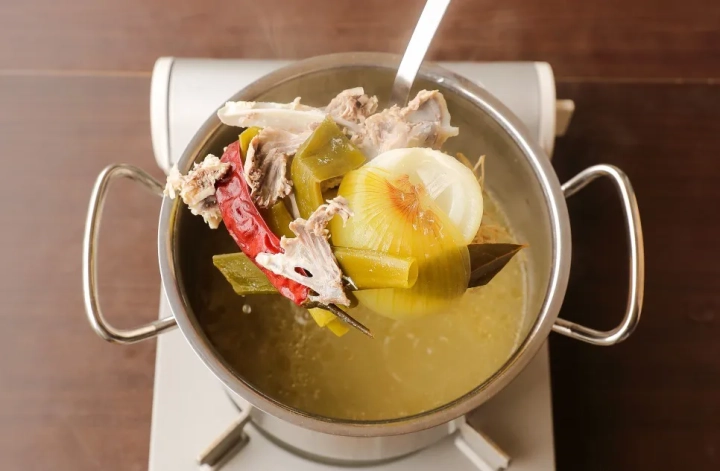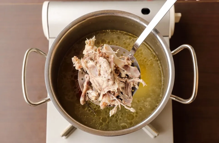 국물에 발라낸 닭뼈를 넣어 뚜껑 닫고 20분 정도 끓여주세요.