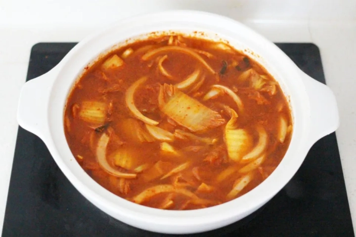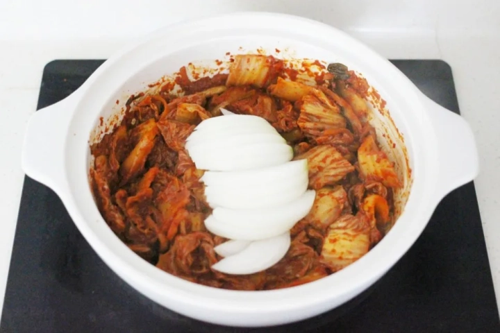 김치가 투명하게 익으면 양파를 넣고 충분하게 볶아주세요.