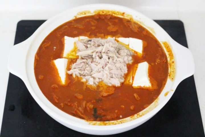 15분 정도 푸욱 끓여준 후 두부와 참치륻 더해 끓여주세요.