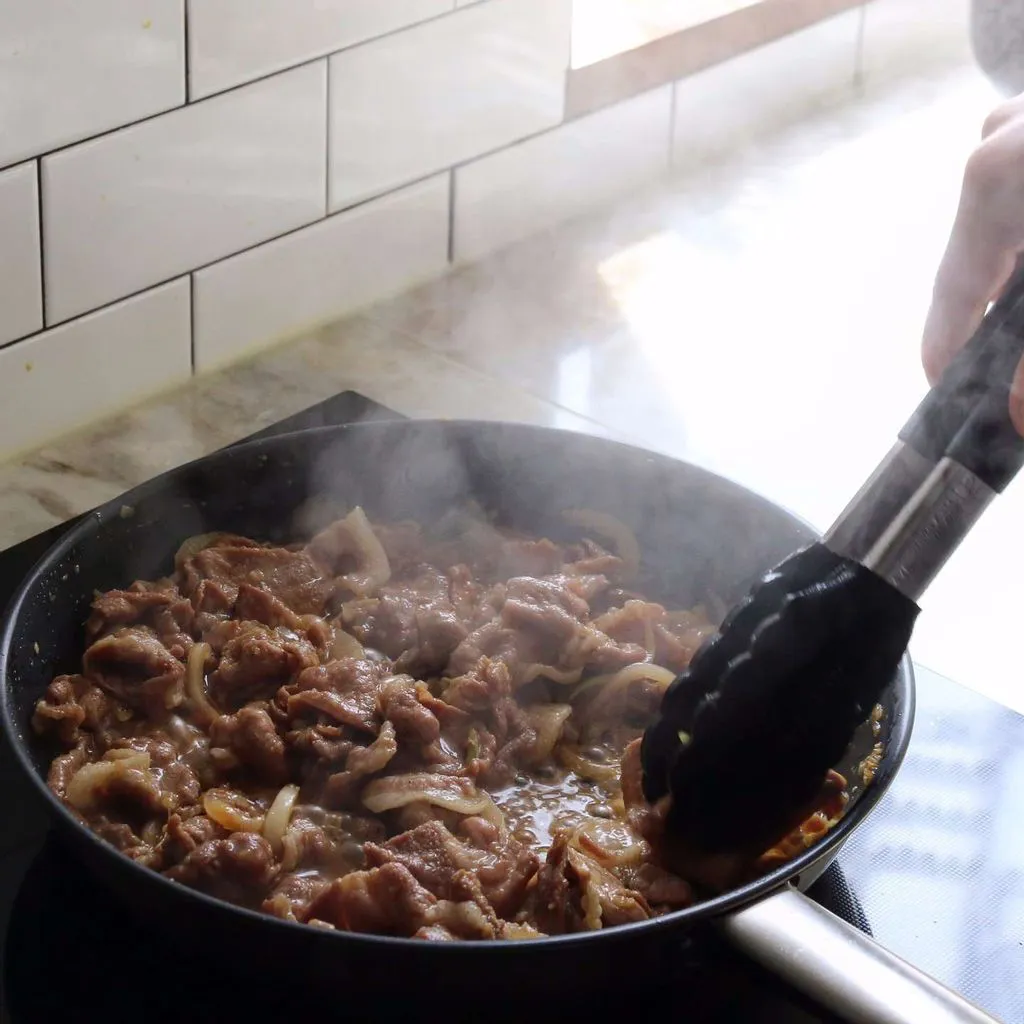 달군 팬에 양념한 돼지고기와 양파를 넣은 후 익혀주세요.