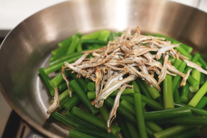 데쳐 놓은 마늘쫑을 볶다가 멸치를 넣고 같이 볶아주세요.