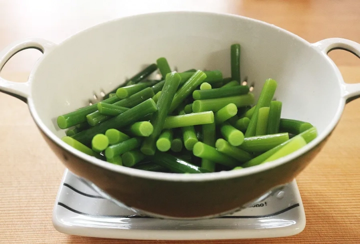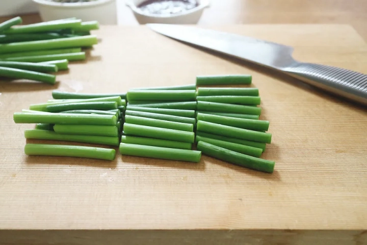 깨끗하게 손질한 마늘쫑은 먹기 좋은 크기로 잘라주세요.