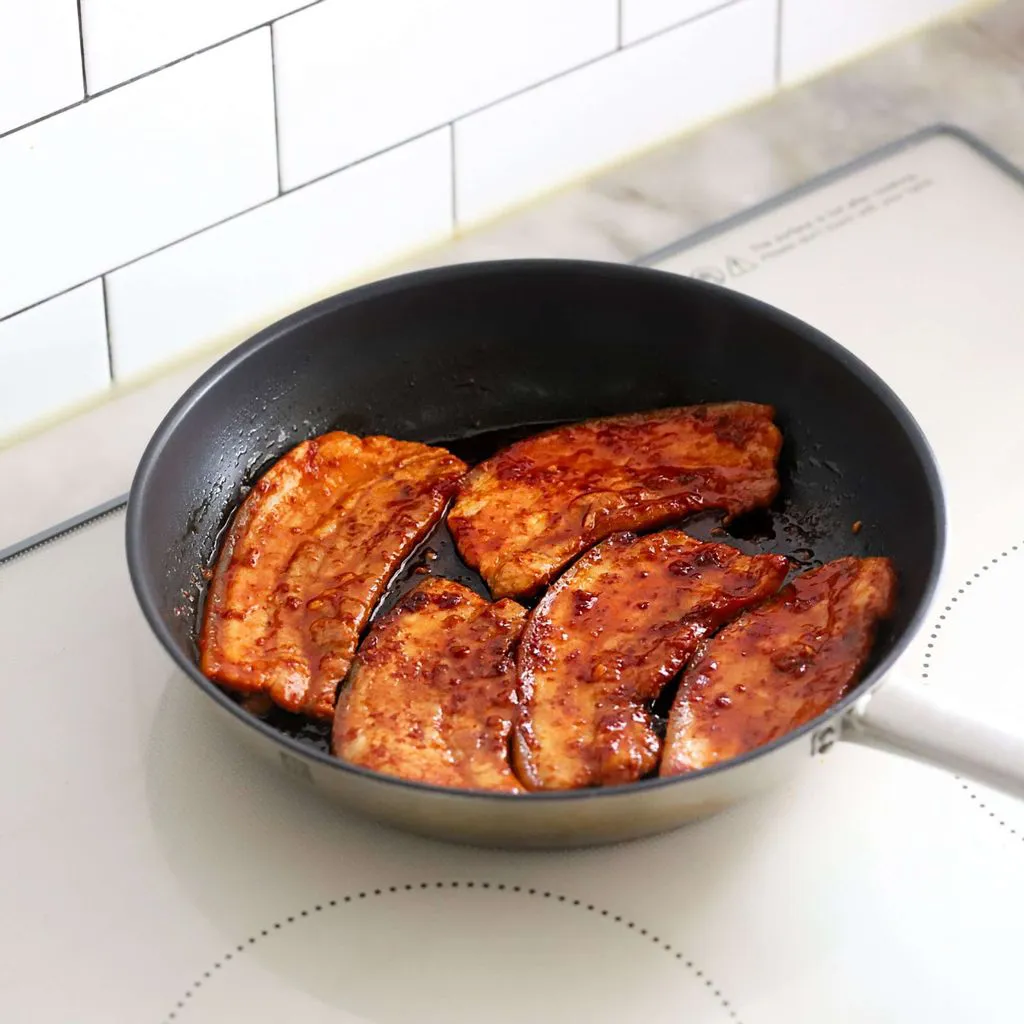 팬에 식용유를 두르고 양념한 삼겹살을 올려