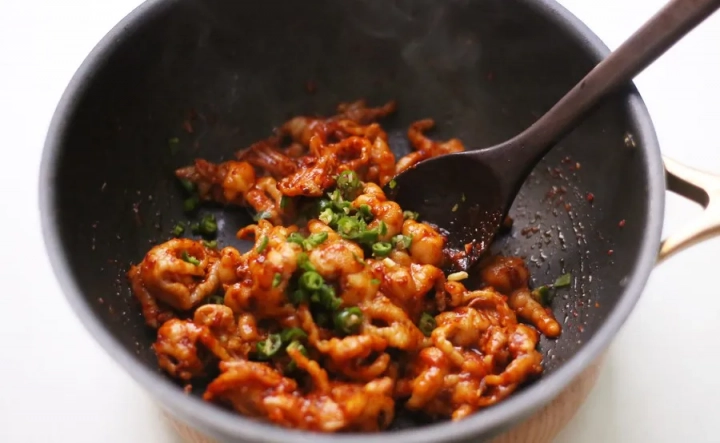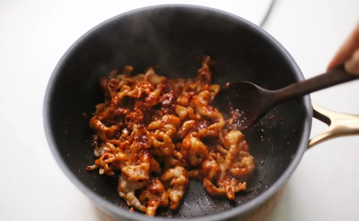 양념장을 넣고 불의 세기를 줄이고 볶아주세요.