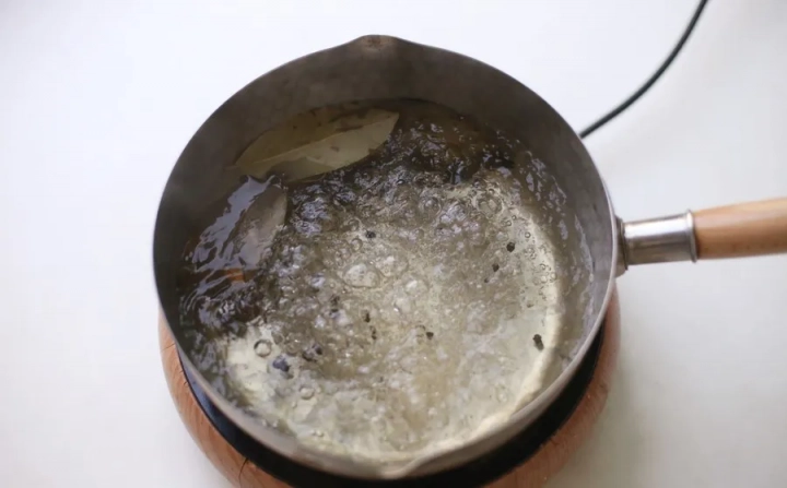물에 월계수잎과 통후추를 넣고 팔팔 끓여주세요.