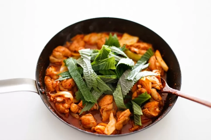 모든 재료가 완벽하게 익으면 깻잎을 더해 볶아주세요.