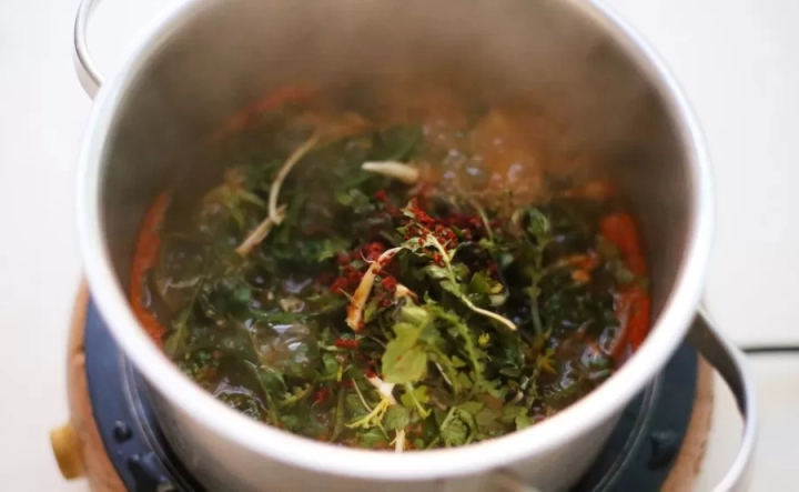 냉이가 국물에 쏙 들어가 숨이 죽으면