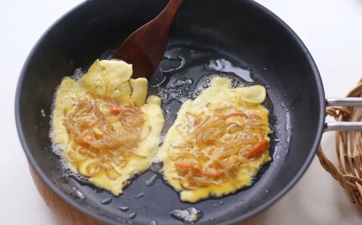 [재료]: 잡채 300ml, 계란 3개, 소금 약간