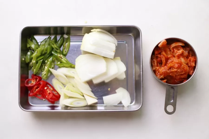 양파 1/4개, 대파 1/3대, 청양고추 1개, 홍고추 1개