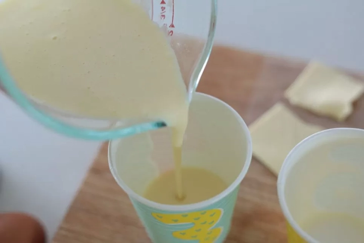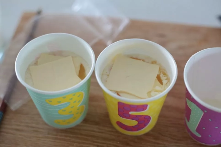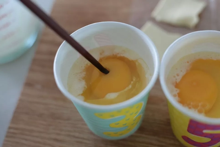 컵에 달걀 하나씩 넣어주고 노른자를 터트려주세요.