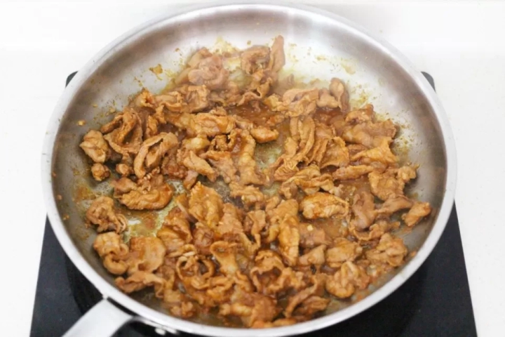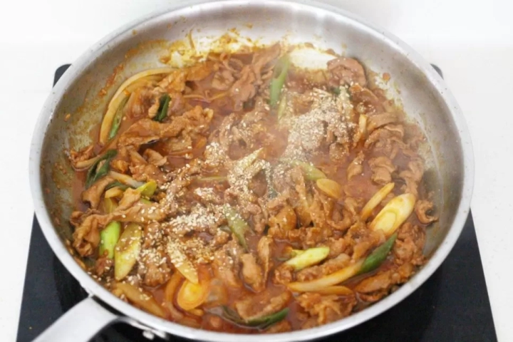 고기가 타는듯 눌어붙기 시작하면 남은 양념을 넣어 볶아주세요.