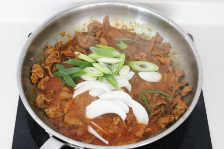 고기가 거의 익어가면 대파, 양파를 더해 볶아주세요.