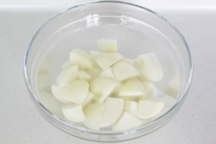 감자는 한입 크기로 썰어 소금물에 담가주세요.